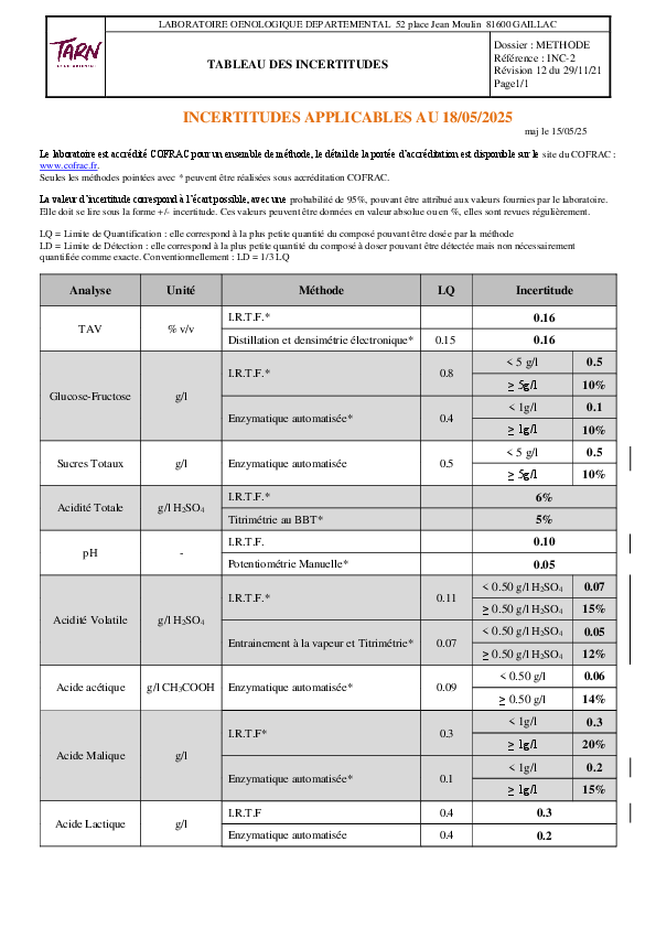 CONTRAT D'ANALYSES AVEC LE LABORATOIRE OENOLOGIQUE DE GAILLAC